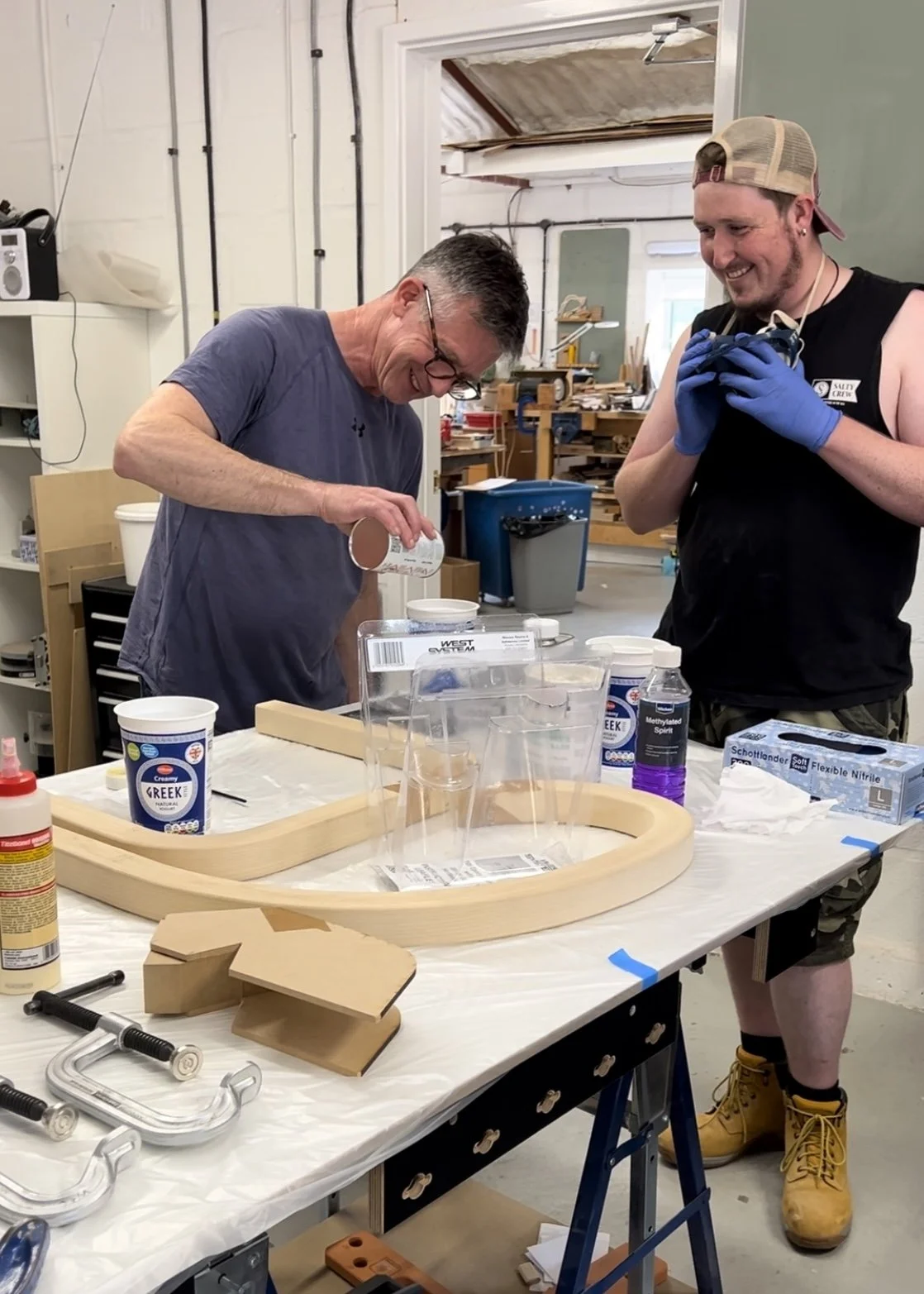 Cam tackles glueing up a section of his freeform laminated occasional bench with the help of his tutor, Justin Williams.